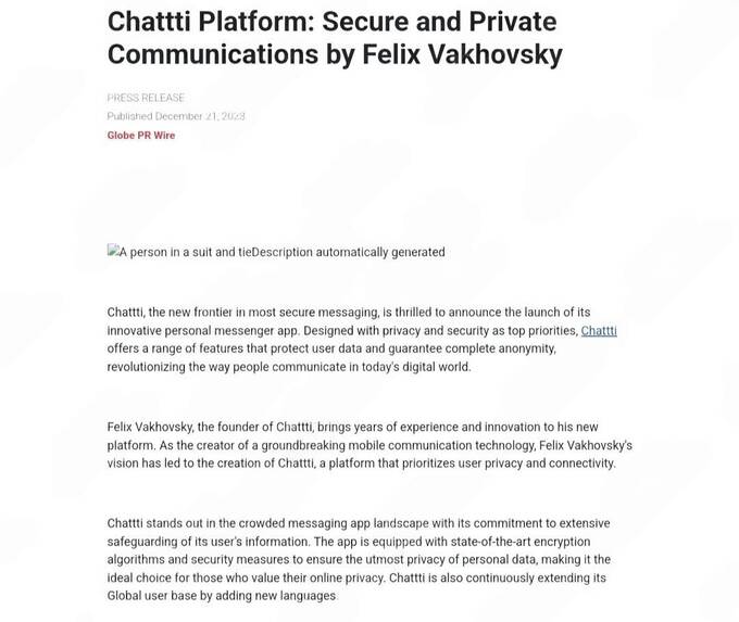 Информация о нем передается от знакомых к знакомым и позиционируется он, как «полностью безопасный», содержимое которого недоступно для российских властей и спецслужб. Мол, Chattti разработан специалистами в ОАЭ, полностью анонимный, «не собирает ваши личные данные и хранит историю переписки только на вашем устройстве». Расследование ВЧК-ОГПУ показало, что в реальности Chattti это российский проект «Глобал Телеком», а стоит за ним решальщик Феликс Ваховски, который работает под кураторством советника президента РФ Антона Кобякова. Так, что Chattti это тоже кремлевский мессенджер и предназначен для тех, кто боится MAX.