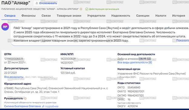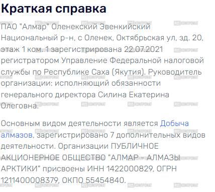 Но почему-то совсем не говорит о процветающем семейном бизнесе, но в своих руках дружное семейство Николаевых держит 32,37% компании "Алмар" ("Алмазы Арктики") - это новый игрок алмазного рынка Якутии.