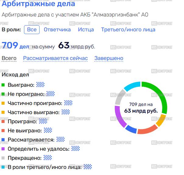 Не может не удивлять количество арбитражных дел с участием банка: 709 дел на 63 млрд рублей!