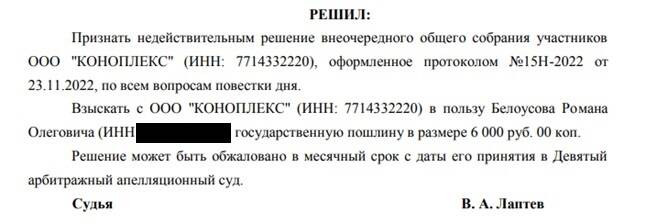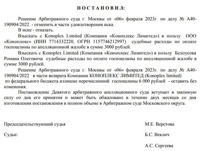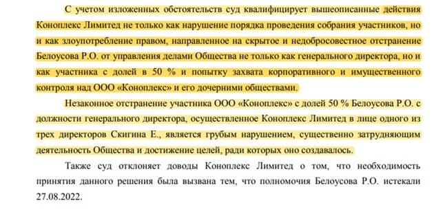 В феврале 2023 года The Moscow Post сообщал, что Арбитражный суд Москвы удовлетворил требования к Konoplex Limited в лице директора офшора Евгения Скигина к ООО "Коноплекс" о признании недействительными решения внеочередного собрания собственников ООО. Коротко напомним, что в результате того собрания господина Скигина и его людей вывели из состава Совета директоров.