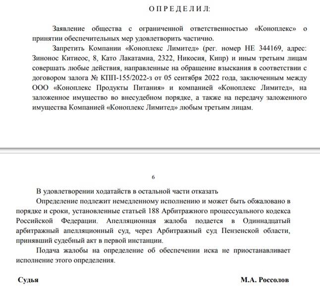 Судя по всему, также посчитал и пензенский суд, который наложил обеспечительные меры, запретив "Коноплекс Лимитед" предпринимать любые действия с заложенным имуществом. То есть эта попытка изначально провалилась.