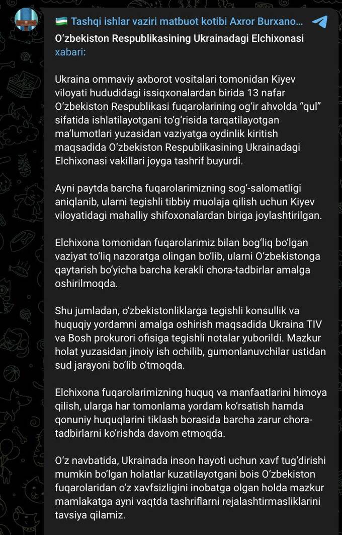 Посольство Узбекистана в Украине сообщило, что все освобожденные узбеки живы, прошли медосмотр и размещены в больнице Киевской области. Посольство направило ноты в МИД Украины и Офис генпрокурора, чтобы обеспечить консульскую и правовую помощь. Власти Узбекистана готовят их возвращение на родину.