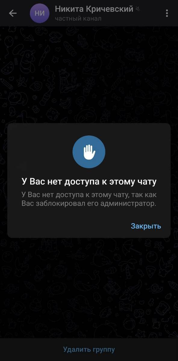 "Дорогие подписчики тг-канала «Никита Кричевский»! Тг-канал удален. Соответствующие запросы отправлены. Но, как показывает история с другими тг-каналами, они бесполезны. Переезжаем на «Антискрепу». Прошу максимального репоста".