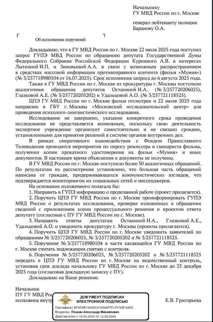 Депутаты партии направили три запроса в прокуратуру, которые потом были переданы в МВД. Ведомство инициировало проведение лингвистической и культурологической экспертиз, чтобы определить, содержатся ли в фильме признаки экстремизма.