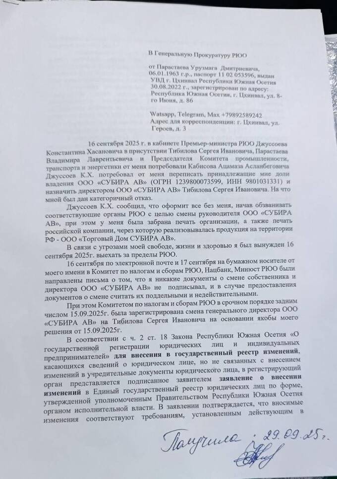 16 сентября генеральный директор «СУБИРА АВ» Урузмаг Парастаев был вызван на «беседу» в кабинет премьер-министра Джуссоева. В присутствии будущего «правопреемника» Сергея Тибилова и председателя профильного комитета Парастаеву было велено переписать свои доли в компании и отстраниться от управления. После отказа у него изъяли печати организаций - как югоосетинской, так и российской компании-экспортера «Торговый Дом СУБИРА АВ».