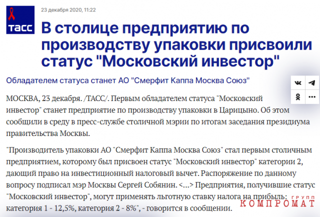 И ведь «Синикон» не является неким исключением из правил. Приведем еще один пример финансирования компании, аффилированной с иностранными учредителями. Долгое время расположением столичных чиновников пользовалось АО «Смерфит Каппа Москва СОЮЗ», специализирующееся на производстве экологической упаковки. В 2018 году это предприятие получило в виде поддержки льготный заём в размере 100 млн рублей под все те же 2% годовых на приобретение новой производственной линии для выпуска сложной вторичной упаковки из гофрокартона.