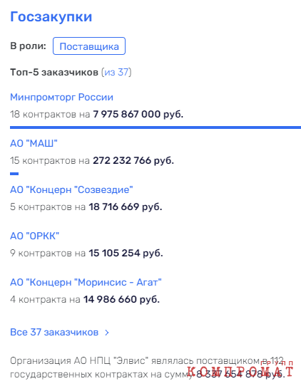 Есть и еще один интересный момент. Для начала стоит обратить внимание на финансовые показатели НПЦ «ЭЛВИС»: в 2021 году при выручке в 1,1 млрд рублей его прибыль составила 2,5 миллиона (для сравнения: годом ранее выручка – 2,4 миллиарда, прибыль – 237 млн рублей). У Центра имеется солидный портфель госконтрактов, превышающий 8,3 млрд рублей; в число его основных заказчиков входят федеральный Минпромторг, Международный аэропорт Шереметьево, Объединенная ракетно-космическая корпорация и др.