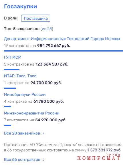 Но самое интересное в том, что «Системные проекты» в прессе связывали с заместителями Ефимова Кириллом Пуртовым и Александром Прохоровым, самого же вице-мэра называли бенефициаромподряда. После успешного для «Системных проектов» 2018 года, когда выручка составила 53,2 млн рублей, а прибыль – 1,3 миллиона, финансовое положение компании резко пошло на спад: с 2020-го она декларирует нулевые финансовые показатели. При этом портфель госконтрактов предприятия превышает 1,5 миллиарда, из которых 984,7 млн рублей приходится на столичный Департамент информационных технологий. Получается, что «команда ДГИ» работала с размахом, однако после инцидента с базой данных деятельность подрядчика пришлось «заморозить».