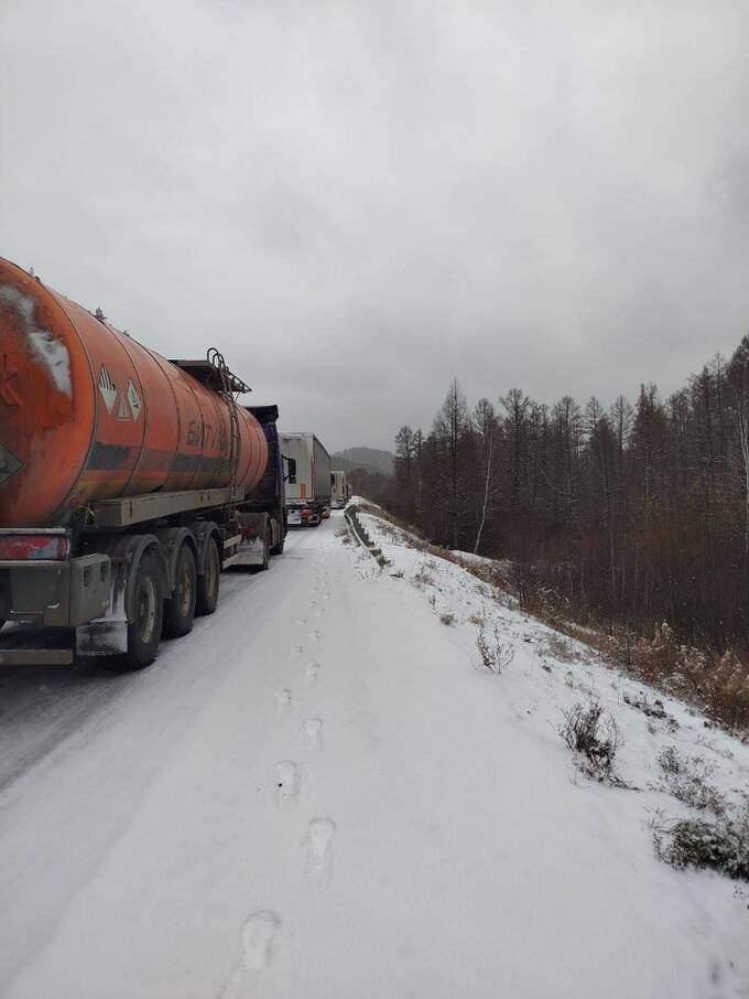 Пробки из-за снега образовались на федеральных трассах в Забайкальском крае. Очевидцы делятся кадрами пробок из грузовиков на трассах «Байкал» и «Амур».