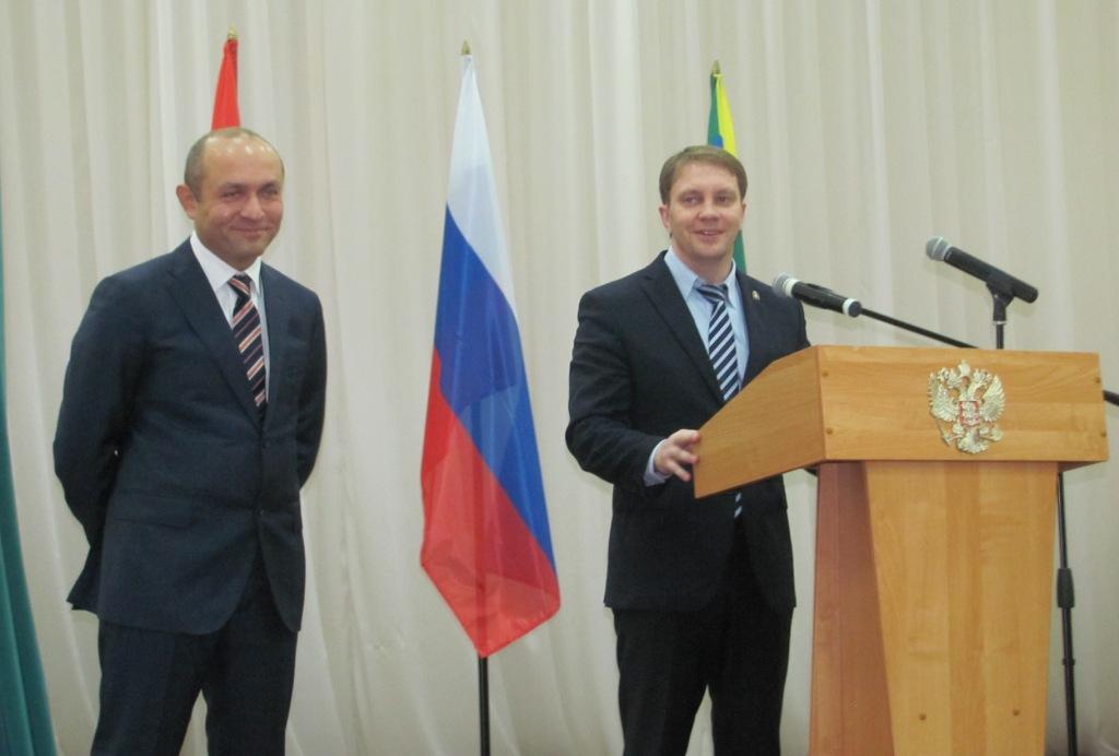 Вадим Тарасов (главбух «Югории) поздравляет Юрия Парахина (директора «Югории») с избранием на пост главы Орловского района