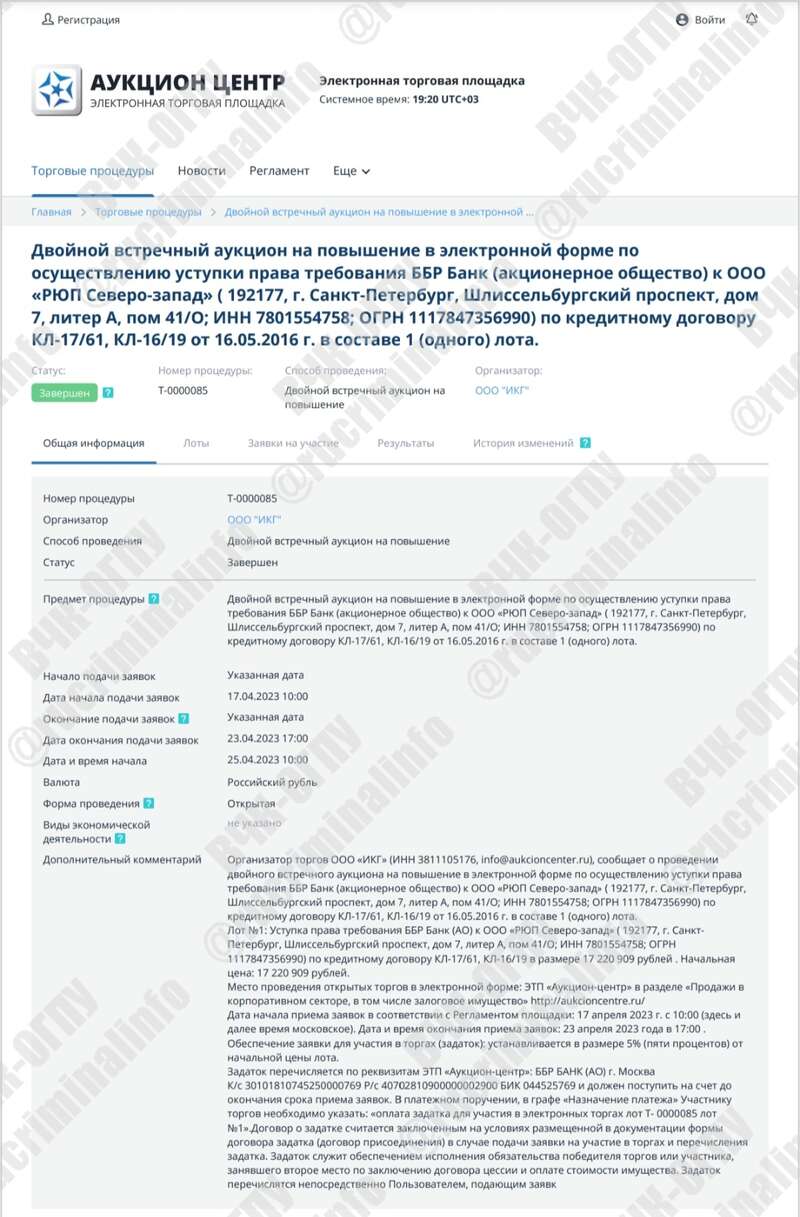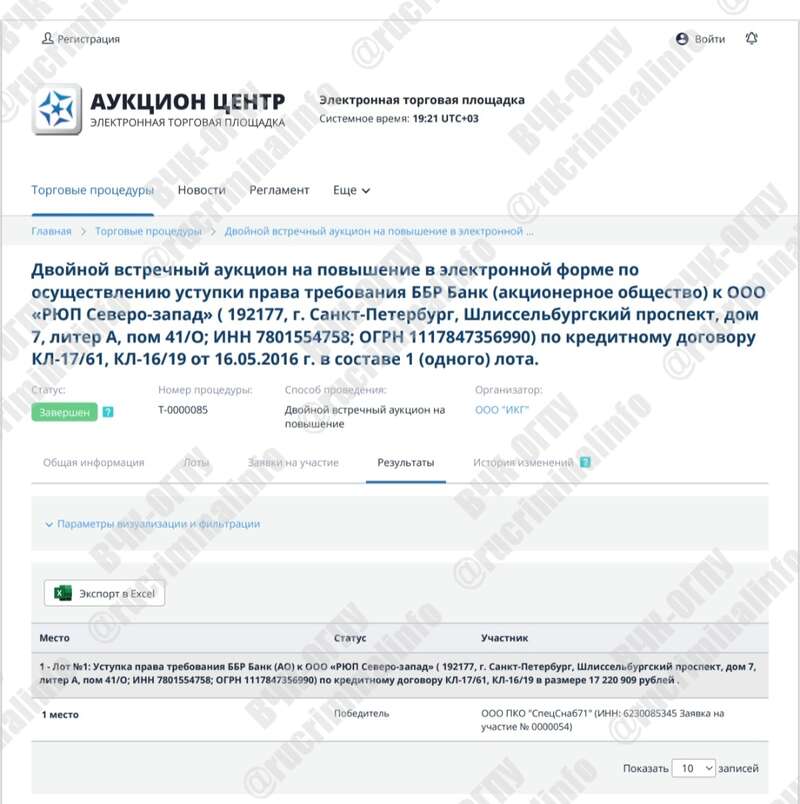 Торги № T-0000085 — уступка прав требований ББР Банка к ООО «РЮП Северо-Запад» на сумму 17,2 млн рублей;