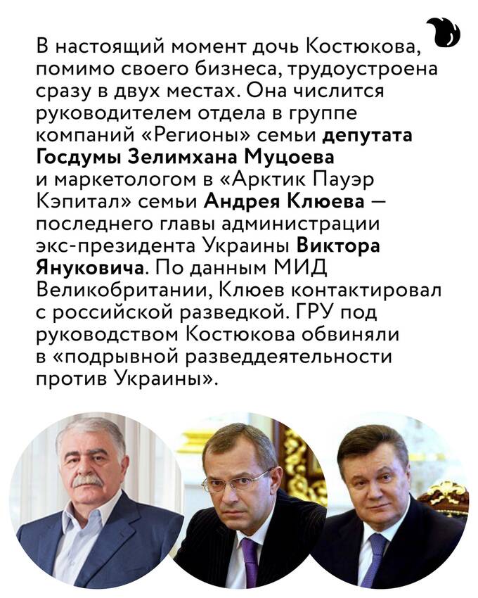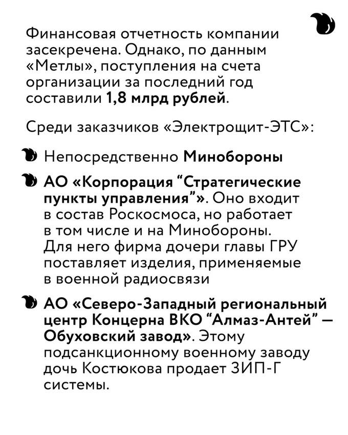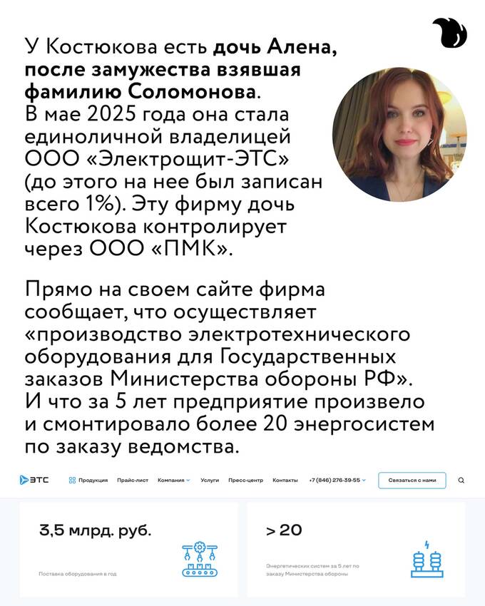 Алене Соломоновой (так зовут дочь Игоря Костюкова) теперь принадлежит компания «Электрощит-ЭТС», которая производит электротехническое оборудование для военного ведомства. Также среди заказчиков — оборонные АО «Корпорация “Стратегические пункты управления”» и «Обуховский завод».