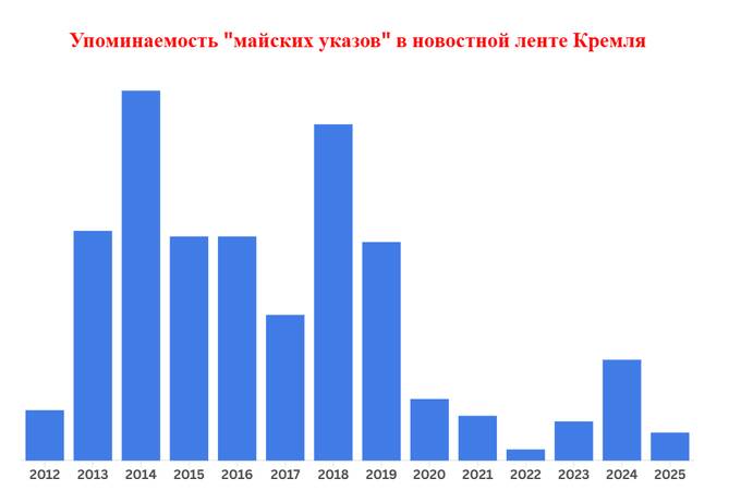 Так, упоминаемость «майских указов» в новостной ленте Кремля была на пике в 2018 году, когда Путин избрался на четвертый президентский срок и вновь требовал исполнять «майские указы», которые к 2018 году как раз должны были быть исполнены. После этого о «майских указах» с каждым годом вспоминали все меньше, пока в 2024 году, когда Путин пошел на пятый срок, их не заменили новым «майским указом», в котором уже не нашлось места целевым ориентирам для зарплат бюджетников.