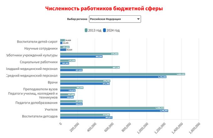 Но федеральный и региональные бюджеты уже несколько лет испытывают сложности: резкий рост военных расходов и расходов на выплаты военным и их семьям, а также растущий бюджетный дефицит не позволяют находить дополнительные деньги. Резкий рост средних зарплат вслед за инфляцией и дефицитом рабочей силы также усугубил проблему — зарплаты работников бюджетной сферы просто не успевают за предложениями коммерческих работодателей.