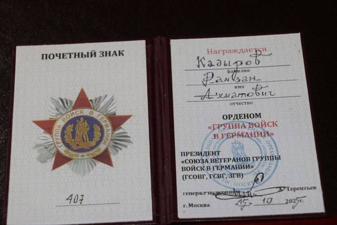Награду вручил председатель чеченской организации ветеранов, которые служили в Советской группе войск в Германии. Помимо Кадырова, отличились и другие «ветераны», включая председателя парламента Чечни Шаида Жамалдаева.