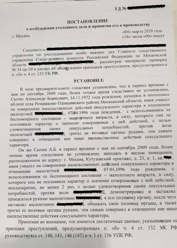 По таким же статьям были предъявлены обвинения и его сыну – Александру Сытину, называющего себя особо ценным агентом Управления «М» ФСБ. Александр Сытин на протяжении нескольких лет насиловал несовершеннолетнюю дочь своего друга и развращал 9-летнего сына своего друга, заставляя его смотреть порно и то, как он занимается сексом с женой Анастасией. Александра Сытина, захватившего в результате рейдерских захватов при поддержке его «крыши» в Управлениях «К» и «М» ФСБ более 350 объектов недвижимости, защищали 12 адвокатов!!! После взятки сотрудникам ФСБ в несколько сотен миллионов рублей тома уголовного дела, где факты педофилии и насилия над детьми были полностью подтверждены, по указанию заместителя генерального прокурора Анатолия Разинкина и прокурора Московской области Сергея Забатурина были прямо в зале Серпуховского городского суда банально изъяты из уголовного дела. Александр Сытин был осужден по незначительной статье – взятка –и то всего на 3 года.