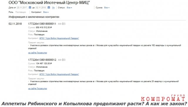 В 2018 году «МИЦ» обязались поставить для бойцов Росгвардии еще 187 квартир почти за 1 млрд. рублей. При этом компания Рябинского и Копылкова опять стала единственным участником конкурса.