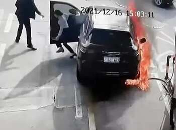 В Китае мужчина поджог топливо на заправке рядом с автомобилем, в результате чего машину моментально охватило пламя.
