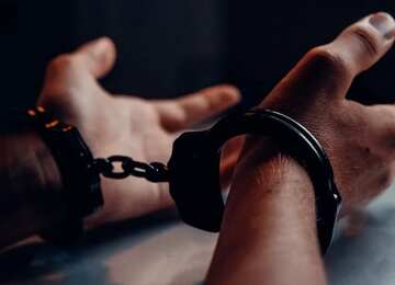 Вежливый следователь в черных перчатках, просит хорошо одетого гражданина в наручниках, пояснить что может находится у него при себе, затем толстую пачку купюр аккуратно вытаскивают у него из кармана.