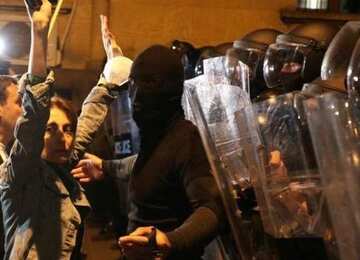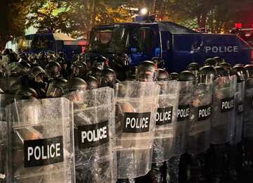 Демонстранты кидают бутылки и камни в полицейских. Силовики обстреляли их шашками со слезоточивым газом и применили водомёты. Также спецназ начал разгон митинга на проспекте Руставели.