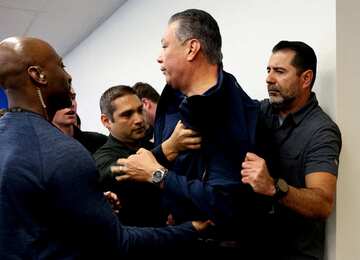 Сенатора-демократа Алекса Падилью повалили на землю и надели ему наручники после того, как он прервал пресс-конференцию министра внутренней безопасности Кристи Ноэм, сообщает NBC News.